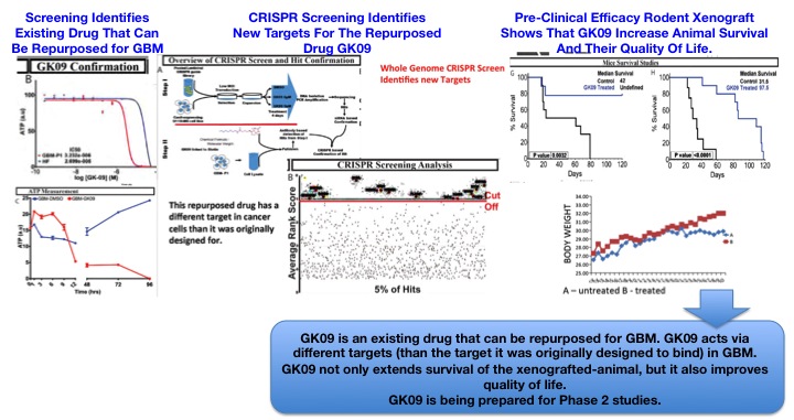 K-Life Solutions identified GK09, an existing drug that can be repurposed for treating GBM. Xenografted mice treated with GK09 survive better than controls. In addition to survival, they show increase in body weight and have an over all better quality of life.